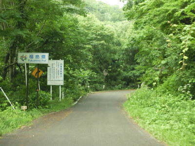 | 2回目の福島県も山岳狭路酷道が続いているが、これまでの区間に比べると断崖絶壁感は薄い。道幅は1.5〜1.8車線幅と若干広くなるが、小刻みなカーブが多く見通しは悪い。山側が少し崩れているような場所があるが、これは設置されたトン土嚢の周辺に雑草が生い茂って崩れたように見えるだけである。なお、土嚢は前回走行時(2012年6月7日)には既に設置されていた。 | ||