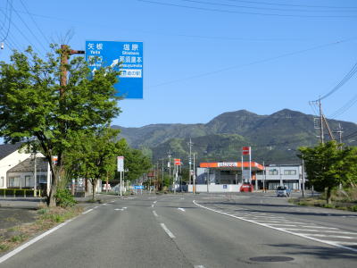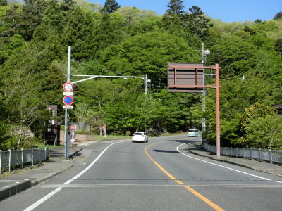| 関谷北交差点の直後に道の駅「湯の香しおばら」を通過する。道の駅がある事からバイパスで回避した場所がかつての塩原町の中心部と思ってしまうかもしれないが、かつての町役場はこの辺りではなくさらに奥にあった。道の駅を過ぎてすぐに左カーブを曲がり山間部区間に入る。異常気象時通行規制のお知らせ看板が設置されているが、起点は約約1.9km先の蟇石橋である。 | ||