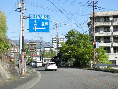 | 鹿股交差点からは上り勾配となり、毘沙門橋を渡って程なくして5%の下り勾配に転ずる。弁天大橋を渡った先で塩原方面の市道との交差点を通過するが、この道路は栃木r56の旧道に当たり、八汐橋の北詰で交差している道路がR400の旧道である。 | ||