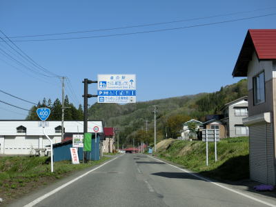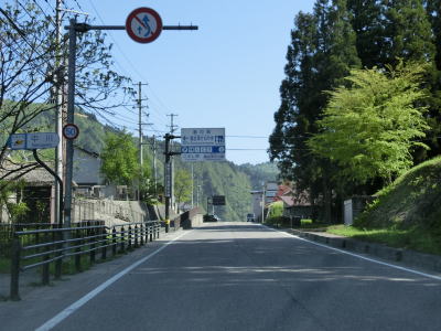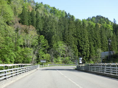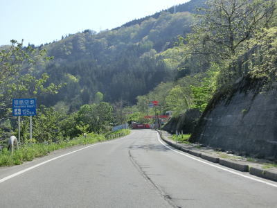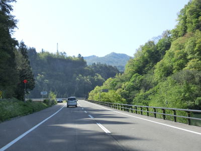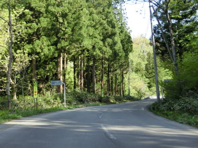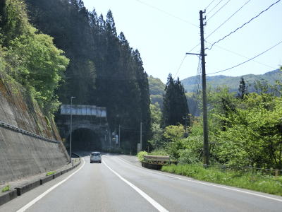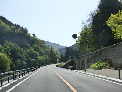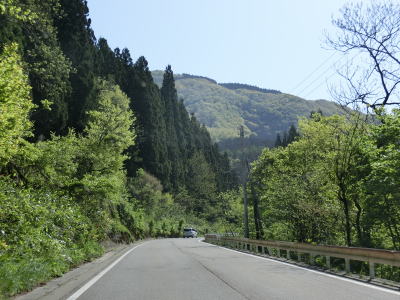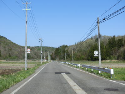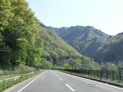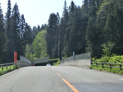 | 喰丸交差点からはR401が重複しているが設置されているおにぎりはR400のみである。しばらくはセンターライン付きの2車線道路だが、勾配が下りになると同時にセンターラインがなくなるように見えるが、消えかけているだけで2車線道路は続いている。融雪水のパイプがセンターライン代わりになると若干道幅が狭くなる。 | ||