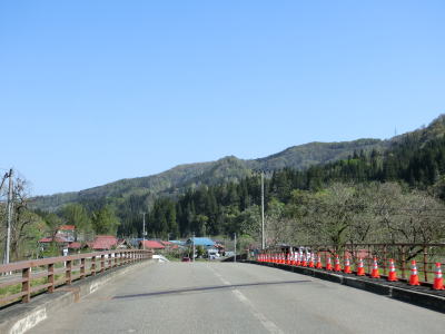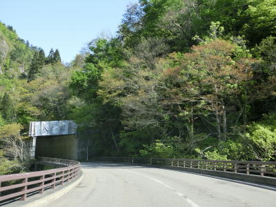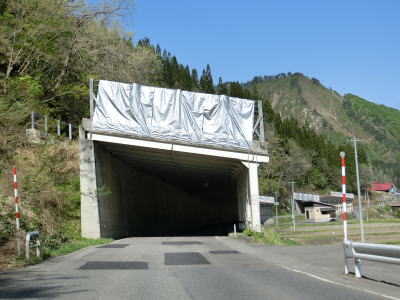 | 高倉スノーシェッドを出ると左側を並走しているJR只見線の細越拱橋の下を走る。さらに進むと三島町に入る。町境の手前は奥会津シンフォニーロードと呼ばれるメロディーロードだが、施行されているのは只見町方面だけである。早戸駅の傍を通り過ぎた直後に早戸温泉郷トンネルをくぐる。 | ||