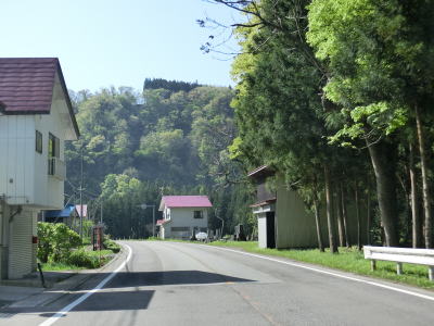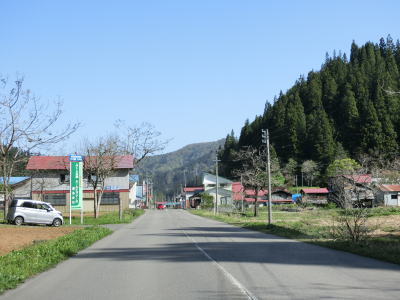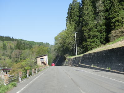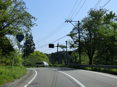 | 喰丸集落の西端で融雪水散布区間が終り、センターラインが消えた2車線道路を走る。ほぼ平坦でカーブも少ないため走りやすい。喰丸郵便局の傍でR401佐倉交差点を通過するとR401の短い重複区間が終わる。R401の大芦方面の新鳥居峠を挟む区間も狭路酷道だが、こちらはバイパスは建設されていない。 | ||