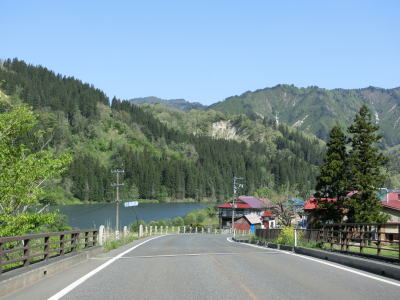 | 道の駅「奥会津かねやま」の前を通り過ぎてすぐにJR只見線の会津中川駅の西を通過する。上田ダムの傍からはセンターライン付きの2車線道路に改良されたばかりの道路を走る。只見川の反対の南側には只見線が並走している。 | ||