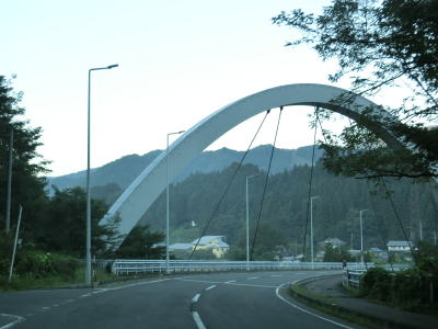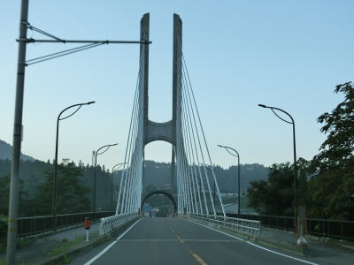 | 小川(大滝調整池)の上に架けられた尾瀬大橋を渡る。主塔の下には落雪で車両の損壊を防止するためスノーシェルターが設置されている。橋を渡り切った直後にR120鎌田交差点に突き当たる。案内標識にR401のおにぎりが表記されていないが、右折してR120との重複区間を沼田・利根方面に進む。ここから終点までの全区間がR120に重複しており、実質的には鎌田交差点が終点と言える。 | ||