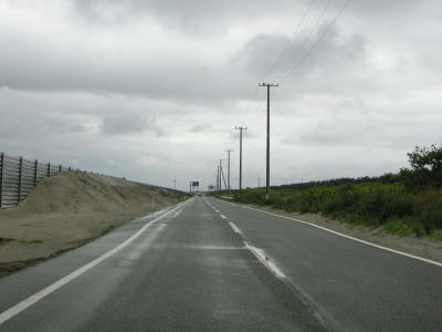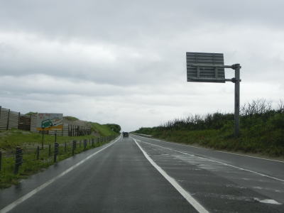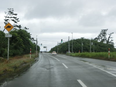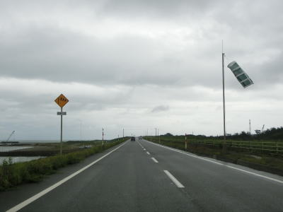 | 海岸線に近い=砂浜にも近いため強風時は砂が路面にまで飛んでくる場所であり、強風時と飛砂時が徐行するように注意喚起する看板が立てられている。場所によっては砂の山が形成されている所もあり、さほど風が強くなくても路面に砂が堆積している可能性もある。 | ||