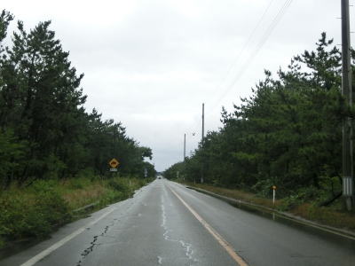 | 新潟r44交差点を過ぎてからも飛砂に注意を要する区間が続いているが、路側帯が広く作られており海水浴シーズンであれば駐停車車両がいるかもしれない。小針方面への市道との交差点を過ぎると防風林が設置されているため海が見えなくなる。 | ||