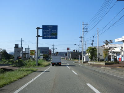 | 渋海川の左岸を緩やかに下って右にカーブした先でR252中仙田交差点に突き当たる。案内標識にはR252のおにぎりしか表記されていないが、R403は左折して松代・十日町方面に進む。重複しているR404も同じく左折である。 | ||