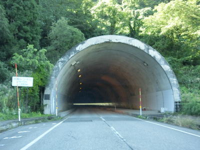 | 渋海トンネルを出てすぐに旧道との交差点を通過して右カーブを曲がる。緩やかな下り勾配の2車線道路を走っていると旧道との交差点を通過した後に岩瀬トンネルをくぐり、出てすぐに旧道と合流する。岩瀬トンネルの旧道には大倉トンネルがあり、制限高は4.1mと小國隧道よりも高いが3.4mの制限幅が設定されていた。岩瀬トンネルには制限高も制限幅も設定されていない。 | ||