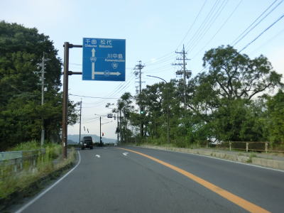 | 両側に歩道が設置されている走りやすい2車線道路を走っていると右にカーブしながら長野r335雨宮の渡し入口交差点を通過する。左折のあんずの里・森方面はR443の旧道である。交差点の東に雨宮の渡し公園があり、川中島の戦いに関する史跡である。当時とは流路が異なっているため現在の千曲川からは離れている。カーブが終わって直線道路を西に向かって走っているとE18上信越道の屋代東橋をくぐる。 | ||