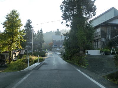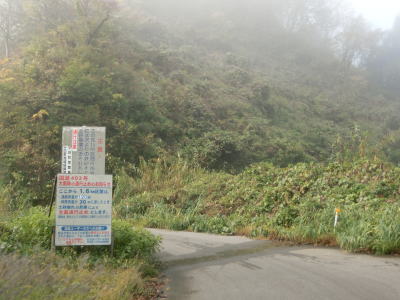 | 渋海川との高低差が生じた所で右カーブを曲がって川から離れる。鉄砲水&土砂崩壊に注意しなければならない区間はこのカーブまでである。冬季閉鎖区間ではないが積雪状況によっては通行止になる事も多く、また落石や崩落等で通行止になる事も少なくない区間である。 旧松代町に入ってからは多少道幅が広くなって1.5〜1.8車線幅になる。以上規制時通行規制区間が終わるのに前後して苧島集落に入るが、集落内は1.0〜1.5車線幅と狭くなってしまう。 |