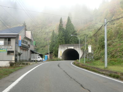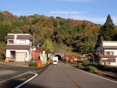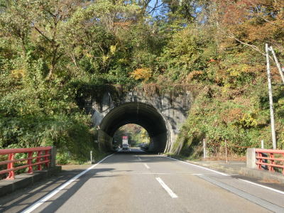 | 儀明集落の端で儀明峠トンネルに入る。開通したのは1979年と40年前だが延長は1202mと結構な長さである。このトンネルをくぐると上越市に入る。トンネルを出ると峠を越えるため下り勾配となる。勾配は緩やかだが上りとなる反対側車線には登坂車線が設置されている。その登坂車線区間の途中で新潟r13交差点を通過する。 | ||