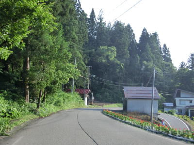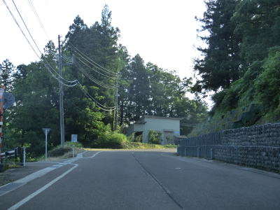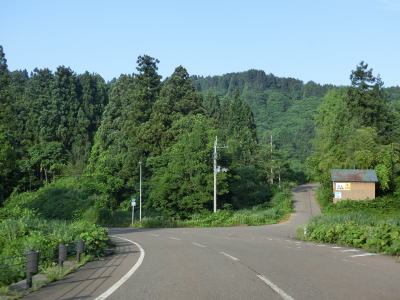 | ヘアピンカーブが連続しているがどのカーブもセンターラインがあり曲線半径も大きいため走りにくいとまでは言えない。ヘアピンカーブ連続区間の中にも集落が存在している。左の急カーブを曲がってからは直線基調になるが上り勾配は続く。ベンチ(テーブル?)が置かれた東屋があるが、駐車場はなく隣の簡易駐車帯に車を停める事になる。 | ||