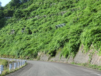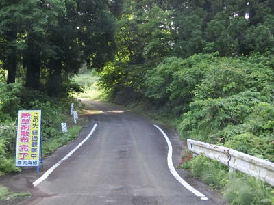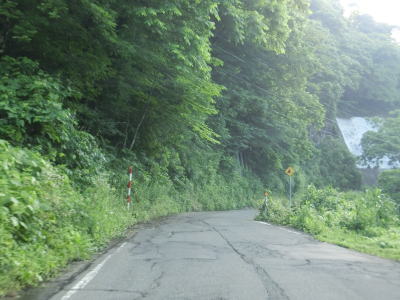 | 土砂流出区間を過ぎると除草剤散布完了区間に入る。経過観察中とのことだったので何らかの新しい手法もしくは薬剤を使用しているのかもしれない。その後はヘアピンカーブが連続しており、道幅も狭いため走りやすいとは言い難い。対向車に遭遇すると酷道度が急激に上がる状況だが、交通量は極めて少なく他車を見る事は稀だろう。 | ||