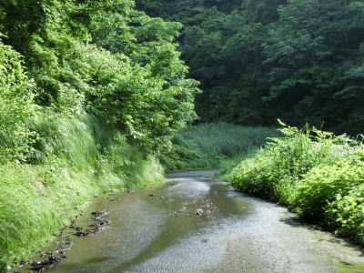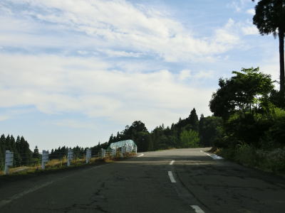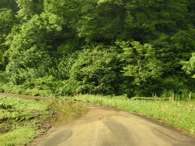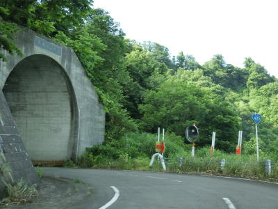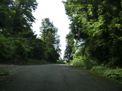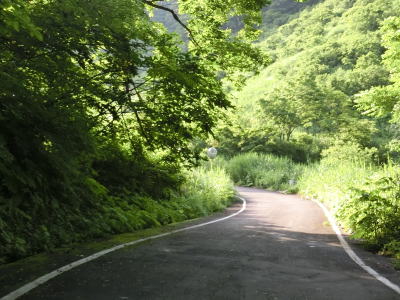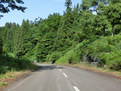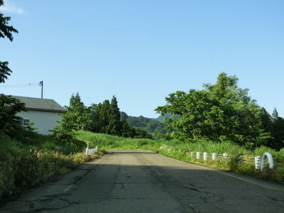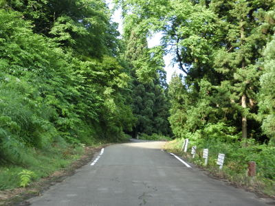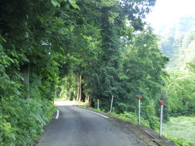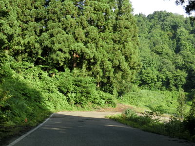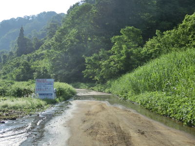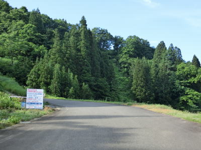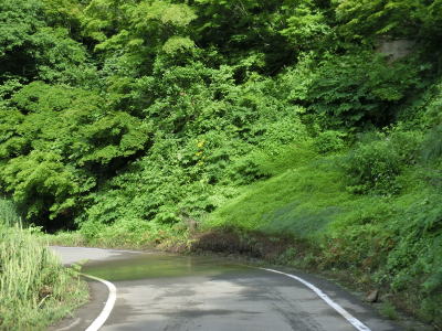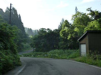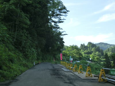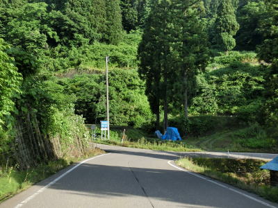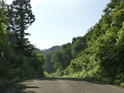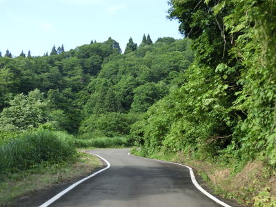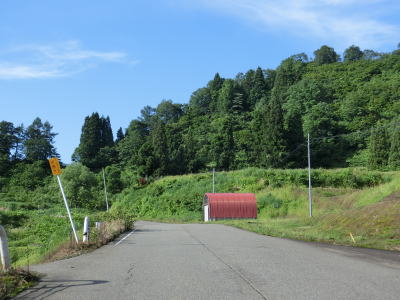 | 家屋数軒のみの樽田集落を通り抜けてからも1.0〜1.5車線幅の狭路が続く。勾配は非常に緩やかだがカーブが多いため見通しは良くない。まだ、十日町市側と同様に数日前の雨に起因すると思われる路上流水があった。 | ||
