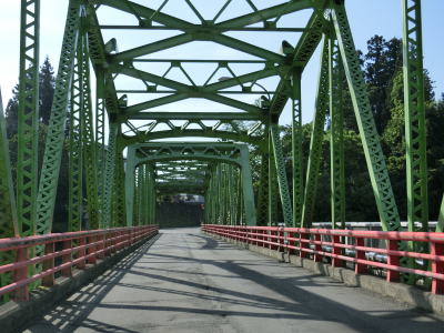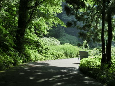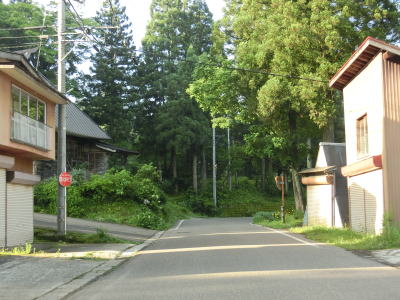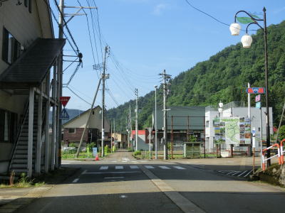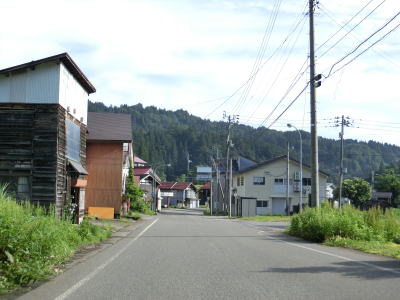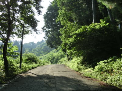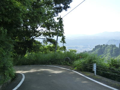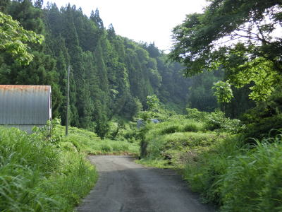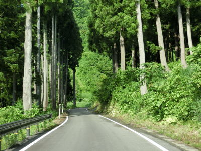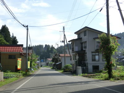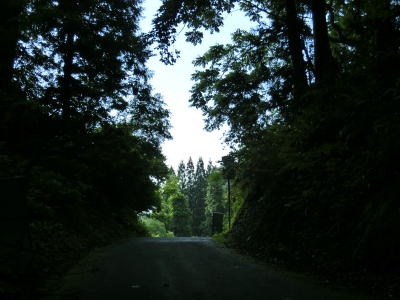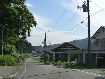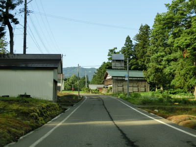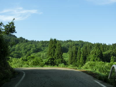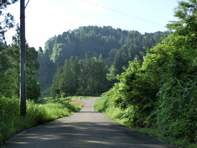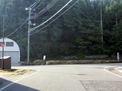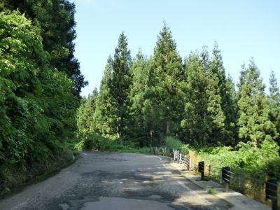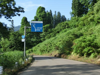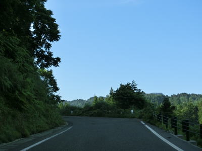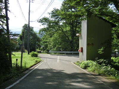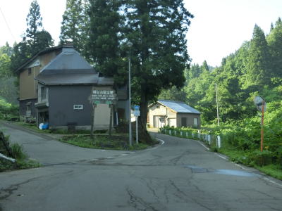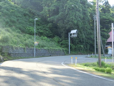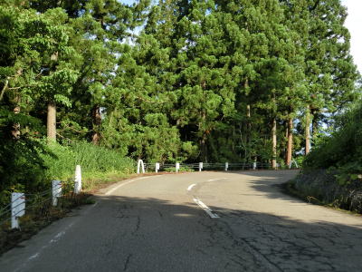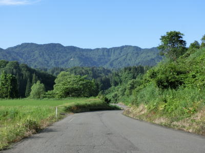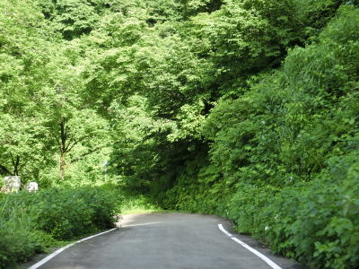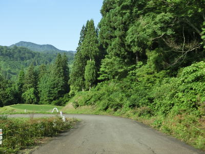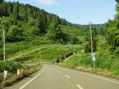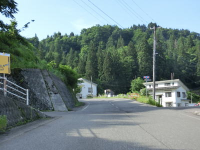 | 市道(林道?)が交差している三方峠を越えると下り勾配になる。道幅は1.5車線と狭いままで、峠から少し走ると急カーブが連続するようになる。しかしこれまでと同様に交通量が極めて少ないため走りにくさはさほど感じない。集落のかなり手前から水田が現れ、人の生活圏である事がうかがえる。 | ||