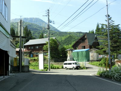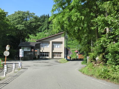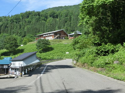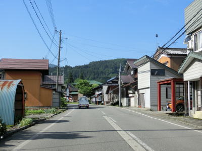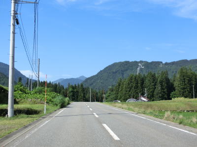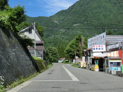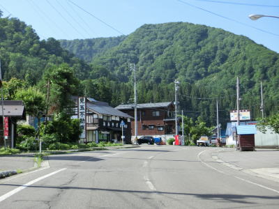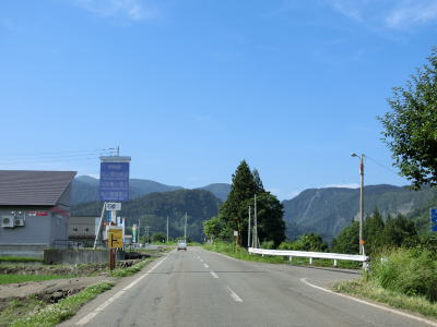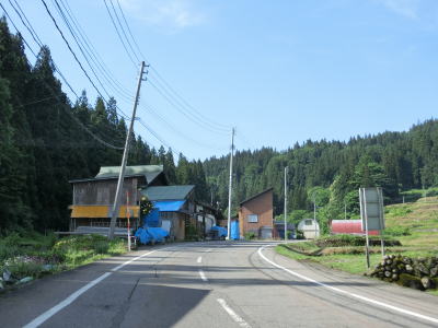 | 西側が開けており眺望の良い2.0車線幅道路を走っていると小赤沢集落を通過する。栄村の中心部から離れており、かつ直接は林道でしか繋がっていない集落ながら、比較的規模が大きくかつては小学校があり、観光地である秋山郷の一部であるせいか土産物店を兼ねた商店の他ガソリンスタンド(ハイオクなし)、民宿なども営業している。 小赤沢集落を過ぎてほとんど勾配のない2.0車線幅道路を走っていると屋敷集落に至る村道との交差点を通過する。屋敷集落には栄小学校秋山分校があったが、2020年に休校になっている。 |
