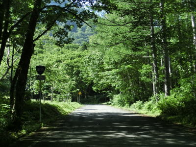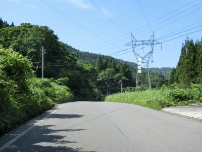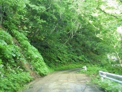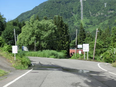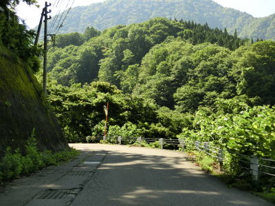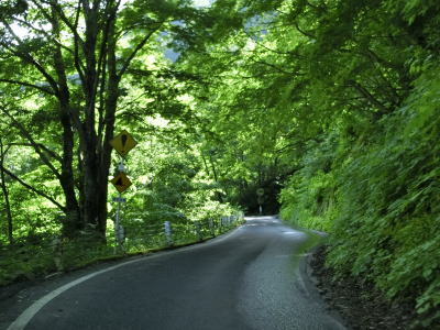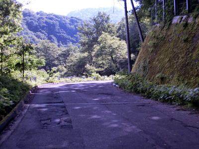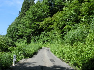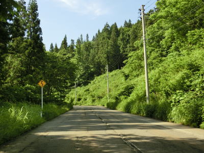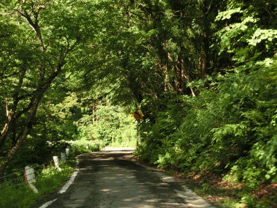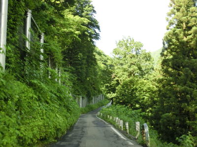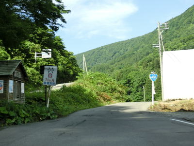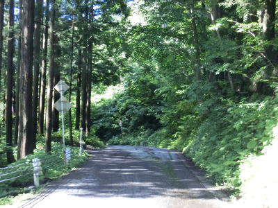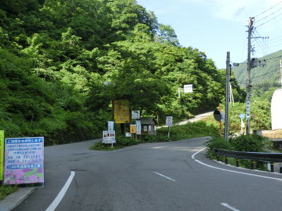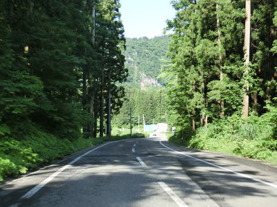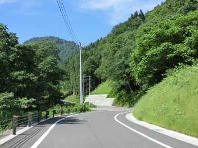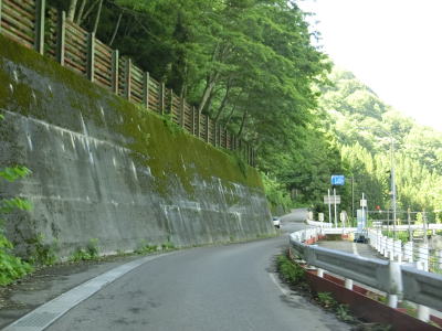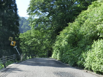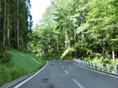 | 急カーブが連続している狭路を走っていると秋山郷のひとつの前倉集落に至る町道との交差点を通過する。集落のさらに先に道路が続いており、長瀬秋山林道を介してR117方面や切明に行く事ができる。その後程なくして1.8〜2.0車線幅から1.5車線幅に狭くなってしまう。勾配はほとんどないがカーブが多く見通しは悪い。 | ||
