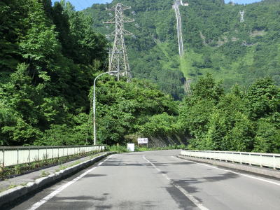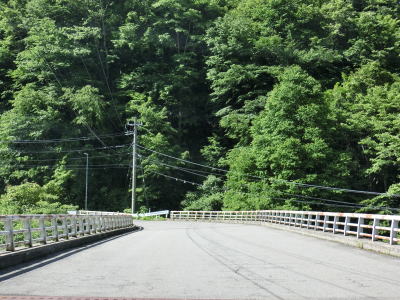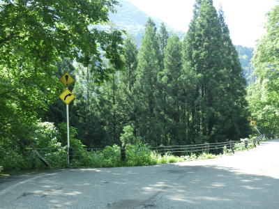 | 2.0〜2車線幅道路がしばらく続くが、まだ1.5〜1.8車線幅の狭い区間も残っている。拡幅工事の現場を通り過ぎて右の急カーブを曲がると栃川橋を渡って左カーブを曲がる。 | ||