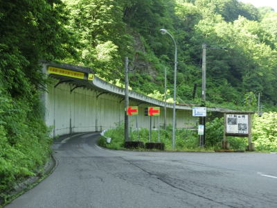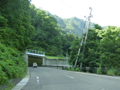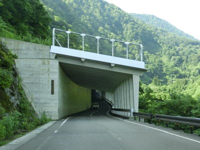 | 2車線の黒滝橋を渡った先で穴藤ダムに至る道路との交差点を通過する。この道路はダムの天端を通って北上すると穴藤集落に行く事ができる。秋成雪覆道と清水川原雪覆道清水川原第2雪覆道を通過する。最初の2つは覆道内も2車線、最後の1つはセンターラインがないものの2.0車線幅と狭い訳ではない。スノーシェッドの整備と同時に拡幅されたものと思われる。まだ、スノーシェッドもコンクリート製と金属製とがある事から何回かに分けて建設されたものと思われる。 | ||
