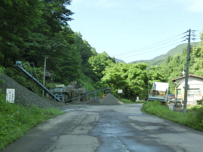 | 秋山郷のひとつの清水川原集落を走っていると東秋山林道が交差している右カーブを曲がる。交差点のすぐ傍に7.0km先の前倉橋に9.0tの重量制限規制がある事の予告がされている。走行した日(2023年6月17日)はこの先のR405が片側交互通行規制を敷いて工事をしているため、東秋山林道へ迂回した方が早く着けるかもしれないとの看板が設置されていた。東秋山林道は全線が舗装されており、道幅は1.5〜1.8車線幅と決して広くないが、少し高い位置を通っているため眺望が良好である。秋山郷のひとつである見倉集落もこの林道沿線にある。 清水川原集落の南端で採石場を通るが、国道を挟んでいるため路面のひび割れが多く砕石の細かい粒子によって白くなっている。そのため砕石会社の私有地を通っているように感じられる。 |
