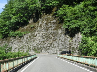 | 採石場の直後に清水川原橋を渡って中津川の左岸に移ると道幅は1.0〜1.5車線と狭く舗装状態も悪くひび割れや凹凸が多い。生い茂った雑草が路面にまで伸びている箇所はさらに狭く感じられる。道幅が少し広くなった所で結東不動尊の前を通る。 | ||