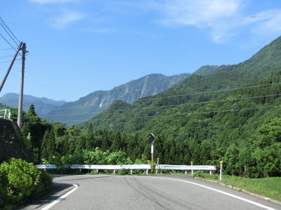 | 中津川の向こうにそびえる鳥甲山(?)を望んだ後に下り、曲線半径の大きなヘアピンカーブ部で堺橋を渡って長野県栄村に入る。橋の下を流れているのは中津川の支流の硫黄川であり、源流に至るまで新潟県津南町と長野県栄村の境となっている。栄村に入ってからは1.8〜2.0車線幅と広くなるため多少は走りやすく感じる。 | ||