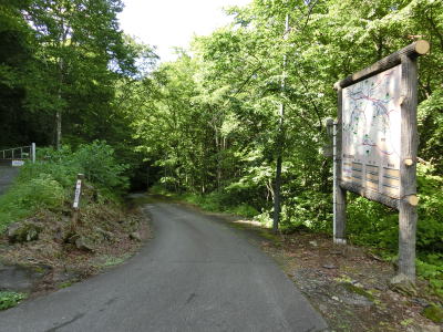| 大割野交差点から約31km、長野県に入ってから約11kmで長野県側端点に到着する。道路が二手に別れており、その手前が端点である。傍にはおにぎりと観光案内板に見える道路案内板が設置されている。この道路案内板はR405ではなく奥志賀公園栄線、つまり長野r502の情報を表示するものである。端点からr502までは秋山林道を通らなければならないため、欲を言えば秋山林道の情報も掲載して欲しいところである。 | ||