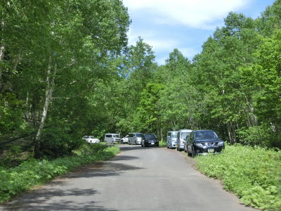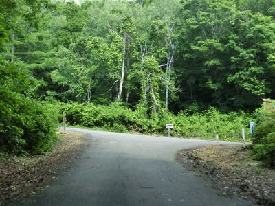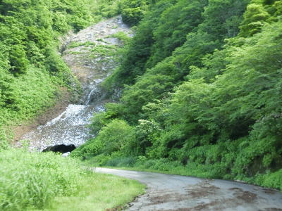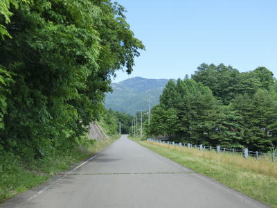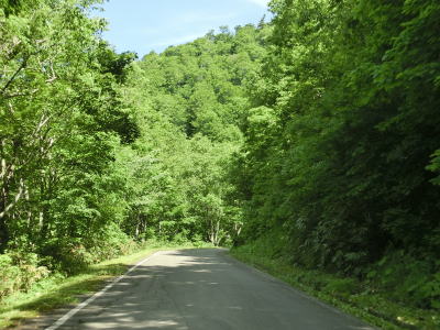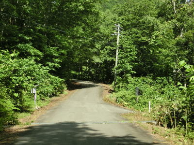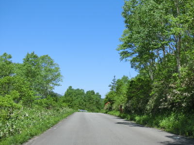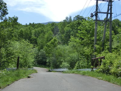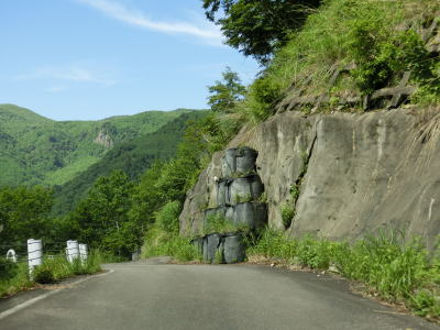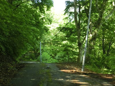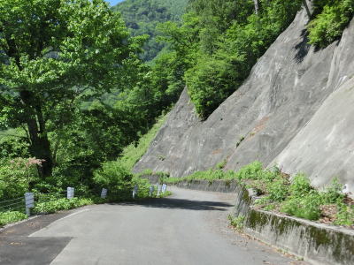 | 村道との交差点を左折してから程なくして鳥甲山のムジナ平登山口を通過するが、ここにも登山客と思われる車両が停まっていた。しばらくは南に進むが右カーブを曲がってからは西に向かって走る。勾配は緩やかで道幅も1.8車線幅程度と広くはないものの強烈な狭さでもない。舗装されており林道である事を失念しそうだが、あくまで林道なので保護されている法面はほとんどなく、崩落しそうな場所もある。また、6月も半ばというのに谷筋には雪が残っていた。 | ||