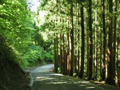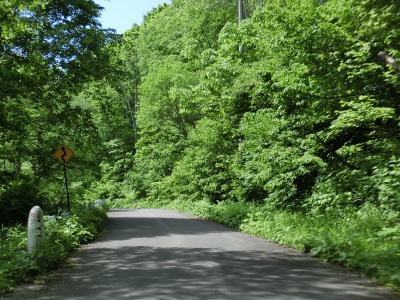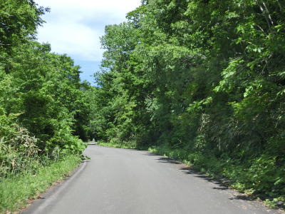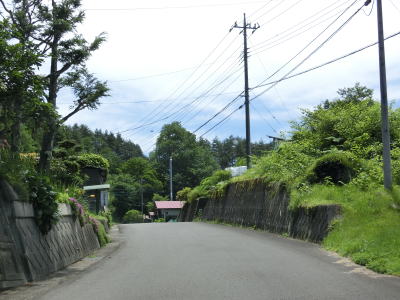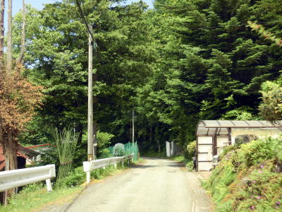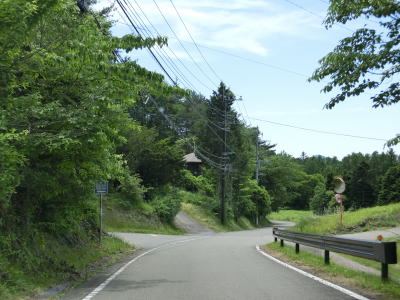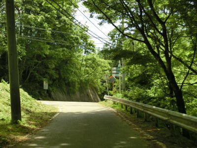 | 1.道幅が狭く路面状況も悪い | 2.村道との交差点を直進 | 3.長い下り勾配が続く |