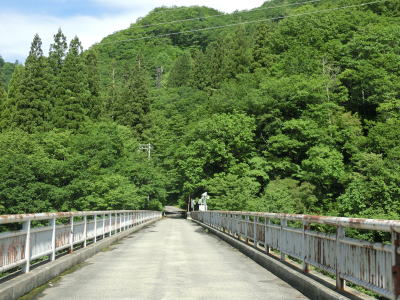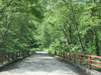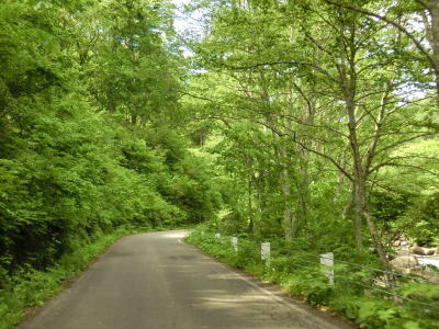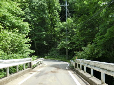 | 長野r502に入ってからもセンターラインのない道路状況が続くが、幅は1.8〜2.0車線と秋山林道よりは広い。ヘアピンカーブを曲がりながら満水橋を渡ると木島平村に入る。雑魚川の右岸を走っており、これまでよりも川との距離は近いが川そのものが見える訳ではない。 | ||