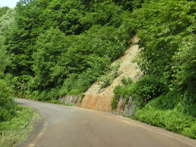| 南に雑魚川が流れており南側が開けており場所によっては眺望が良い。R405にも土砂が流出していた場所があったが、秋山林道も同様で、約700mに渡っていた。傍に置かれた重機によって路上の土砂が除去されたと思われる。土砂が流出した区間を過ぎた後にヘアピンカーブを曲がりながら鬼沢橋を渡る。 | ||