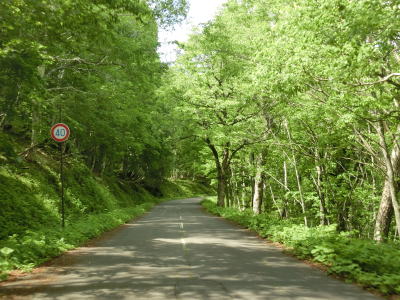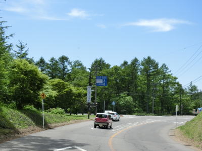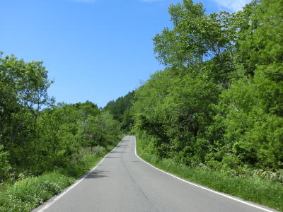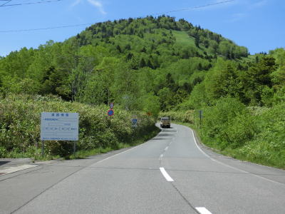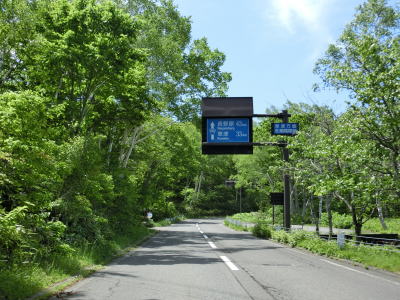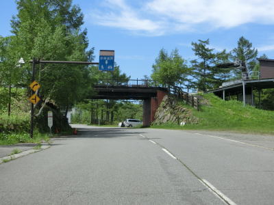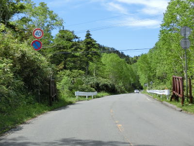 | 町道との交差点からは左側にホテル、右側のスキー場の駐車場という中を走る。緩やかな上り勾配で車線幅も広いが、上下線それぞれの左側は歩行者用の通路である。「歩車道界」という標識が設置されているが、ここ以外で見たことはない。旧道らしき道路との交差点を道なりに右へカーブしながら通過し、約600m走った所で旧道と合流する。 | ||