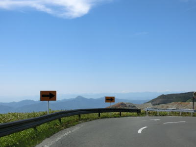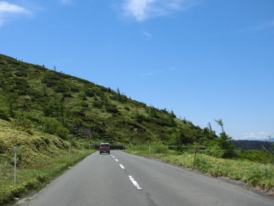 | 渋峠を越えて群馬県中之条町に入ってからは眺望がさらに良くなる。約800mで国道の最高地点を通過する。標高は渋峠よりも高い2172mである。2つのヘアピンカーブを曲がってからは県境沿いを走り、山田峠を越えると中之条町を出るが、嬬恋村と草津町の境界未定地域のため境標識は設置されていない。 白根山レストハウスを過ぎてからはヘアピンカーブが多くなる。火山由来の硫化水素が発生している殺生河原を通過してからもヘアピンカーブが連続している。この辺りはスキー場の中を通っている。 渋峠から約18.2km、草津町の中心部の手前で群馬r55との交差点がある。r55は草津町の中心部を通らずにR405群馬県側端点に行く事ができるが、狭路区間があるため万人にお薦めできるルートではない。走行した日は観光客が多く渋峠以降のペースが上がらなかったため少しでも交通量が少ないであろう事を期待して左折してr55へと車を進めている。 |
