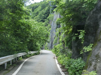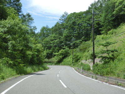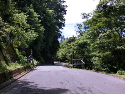 | R405の長野県側端点から秋山林道に進むとやや急な勾配を下り始める。道幅は1.5車線幅と狭く、路面状況も悪く凹凸が多い。いくつかのヘアピンカーブを曲がって標高を100m程落とすと村道との交差点を通過する。この村道はpart3のNo.165の写真で交差している道路であり、切明温泉に行くのが目的であればこちらを通る選択肢もある。村道との交差点以降も下り勾配が続いており、連続ヘアピンカーブで標高をさらに下げる。 | ||