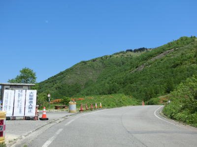 | R405に入ってから程なくしておにぎりの傍を通過するが、補助標識には野反湖までの距離が記されている。迂回路の町道との交差点から最初のおにぎりの補助標識には9kmとなっている。和光原集落を通り過ぎると雨量通行規制区間に入るゲートの脇を通過する。冬季閉鎖もここから北の区間である。 ゲートの直後に左のヘアピンカーブを曲がり、その後もカーブが連続しており見通しが悪い。走行した日もフィットとロードスターの衝突事故が発生しており、ちょうど警官が到着したところであった。 |