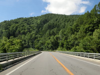 | 約2.5kmに及ぶ長い登坂車線が終わってからも上り勾配が続いている。山肌に造られた仙仁大橋が見えて少しだけ並走(?)した後に左ヘアピンカーブを曲がって仙仁川を渡り、さらに急になった勾配を上る。 | ||