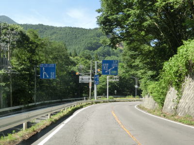 | 登坂車線が終わってからも急勾配を下っているとR144菅平口交差点に至る。R406は案内標識に表記されてないが、左折して長野原・嬬恋・草津方面に進む。左折する角度が鋭角だが、乗用車であれば問題なく曲がる事ができるだろう。 | ||