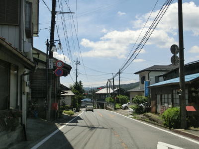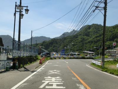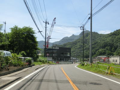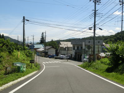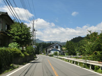 | 交通量が少ない2車線道路を快走していると群馬r377との交差点を通過する。r377は路線名を川原畑大戸線と言って起点は吾妻川の左岸にあるが、橋の前後のみが供用されており大部分は分断区間である。 r377交差点から程なくして塩ノ平集落に差し掛かり、センターラインのない1.5車線幅道路になってしまう。家屋が密集しているという程ではないが、そもそも川と山の間の狭い場所を通っているため拡幅が難しいのかもしれない。 |