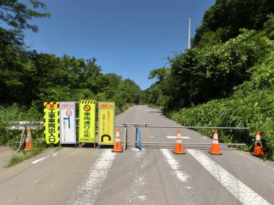 | 東側の通行止箇所はR145とR406の交差点、つまり本来R406がR145から単独分岐する交差点であった。しかし工事が行われているのはだいぶ西のようで視界の届く範囲には工事車両等は確認できなかった。通行止ゲートから奥を見るとおにぎりが残っているのが確認できる。なお、工事期間は2018年3月31日までとなっているが、既に八ッ場バイパスが供用されているため、4月1日以降に通行可能となるかは何とも言えない。 | ||