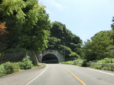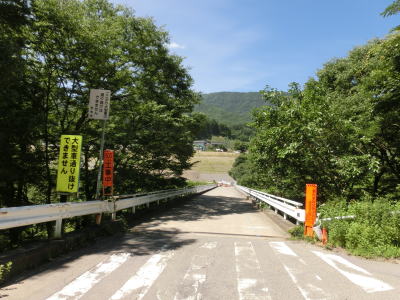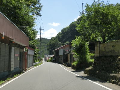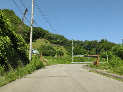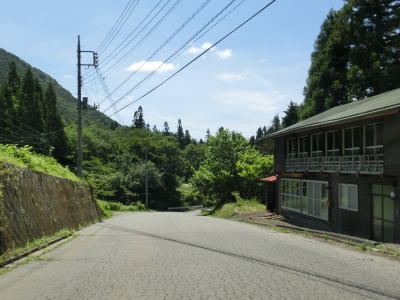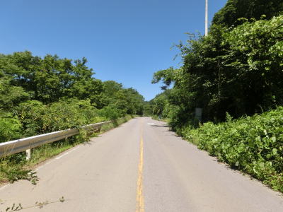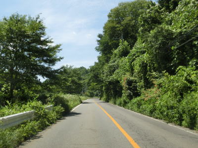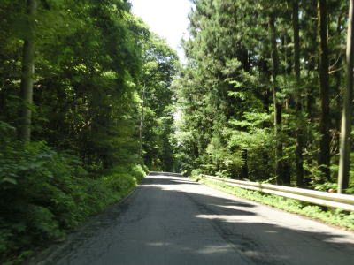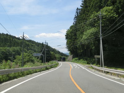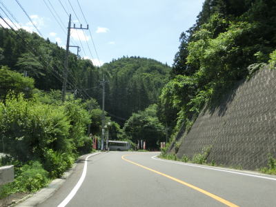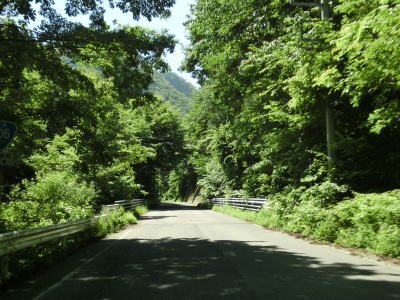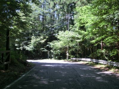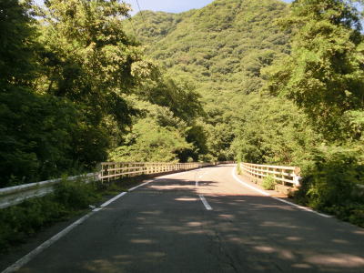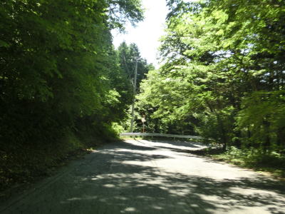 | 須賀尾峠から約1.6kmで閉鎖用ゲートを通過し、東吾妻町で最初の集落の矢竹集落を通過する。集落と言っても家屋は数軒しかなく規模は小さい。集落からセンターラインがなくなり、ヘアピンカーブを過ぎて少し進んだ所で道幅が狭くなり、鬱蒼とした木々の下を走る。 | ||