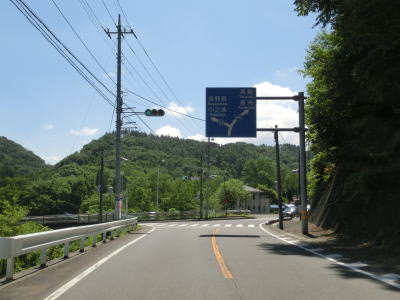 | 上り勾配の1.5車線道路を走っていると勾配が急になった直後にR145八ッ場バイパスとの交差点に至る。現道との交差点からの距離は約400mである。R145現道とバイパスの間の区間は大型車が通り抜けられないと警告されており、また集落内を通るためか案内標識は設置されていない。R406は直進して高崎方面へ進む。なお、バイパスを走っている場合は案内標識が設置されている。 | ||