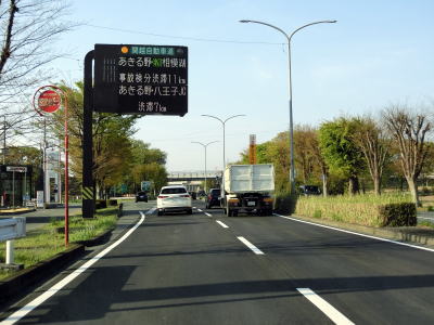 | やや急な左カーブの先で埼玉r195鍵山交差点を通過する。霞川に架かる霞橋は新橋の架橋工事のため仮設橋を渡り、その直後にR16・R299・R463河原町交差点に至る。この交差点がR407の終点である(R299及びR463もこの交差点が終点)。なお、R299、R463ともに現道と並行してバイパスも存在しており、八王子方面に約2.3kmの小谷田交差点で交差している。 | ||