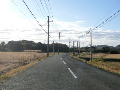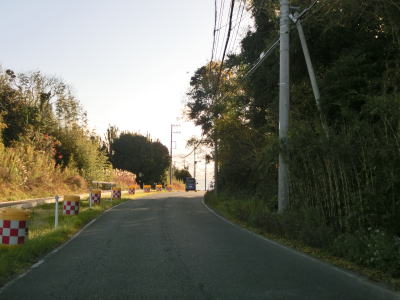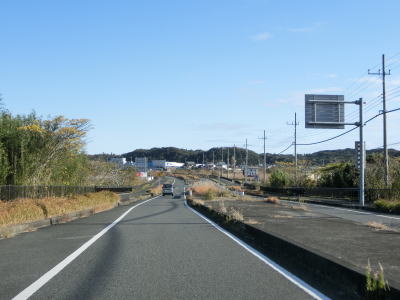 | 安馬谷交差点の直後は1.8車線幅とやや狭い道幅の道路を上る。拡幅工事が行われているようだが拡幅用地にはポリドラムが置かれており雑草が生えていた。重機も見当たらない事からもしかしたら工事が中断しているのかもしれない。 勾配を上り切るとセンターライン付きの2車線道路になる。道の駅「ローズマリー公園」に至る市道との交差点を通過する。その後センターラインがなくなり再び1.8車線幅道路になる。右カーブを曲がるとJR内房線の西側を並走しながら南に進む。 |