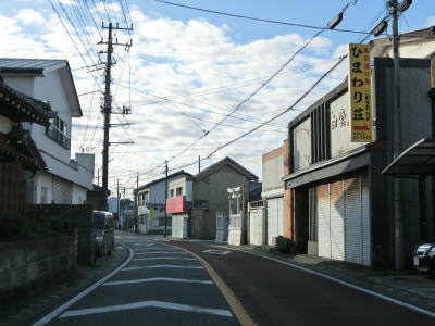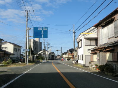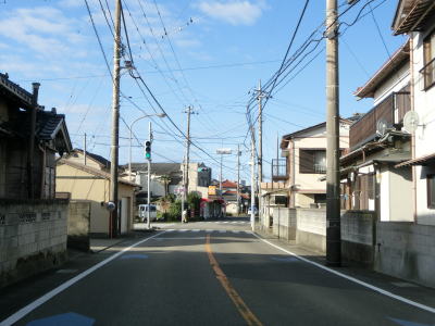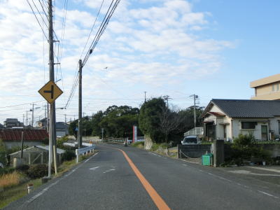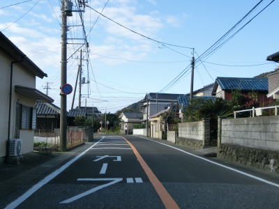 | 歩道がなくなった2車線道路を走っていると沿線の家屋が増える。家屋密集地を下っていると市道との交差点を左折し、直後のT字路を右折しなければならない。案内標識がなければ間違いなく直進してしまうだろう。逆方向に走行している場合も案内標識がなければ直進してしまう可能性が高い。 | ||