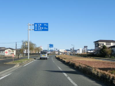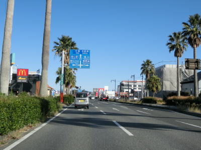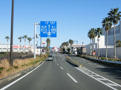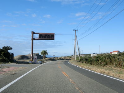 | 千葉r86交差点からも引き続き海岸線沿いを走っており、海の向こうには伊豆大島と思われる陸地が確認できる。太平洋に面しているため強風が吹く事も多く、飛砂に注意を促す看板や電光掲示板の表示が確認できる。良く晴れた日曜日に走行したが、夏季と比べると観光客はあまり訪れないのか、交通量はさほど多くなかった。 | ||