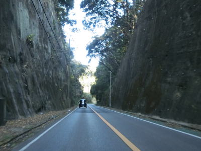 | 藤原交差点からは上りとなるがその勾配は緩やかで走りやすさには変化はない。館山運動公園の近くで右、左とカーブを曲がった先で真倉の切割を通り抜ける。トンネルを掘らずに20〜20mも切り割られた風景は圧巻である。50m程東には明治期の切割も残っているが、廃止から80年が経過しており車両では進入できない。 | ||