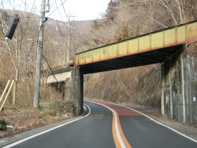 | 鳩ノ巣駅を通り過ぎて直後に鳩の巣トンネルをくぐり、少し先で花折トンネルをくぐる。前者は鳩ノ巣渓谷、後者は白丸ダムへのアクセスルートのため、どちらの旧道も現在でも通行可能である。白丸駅の近くで左にカーブしている草木沢橋を渡って集落を通り抜ける。 | ||