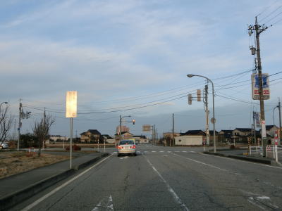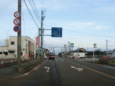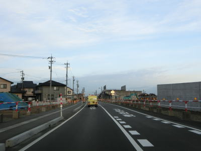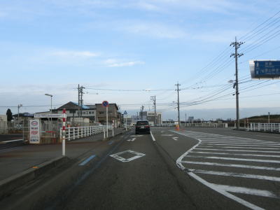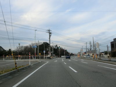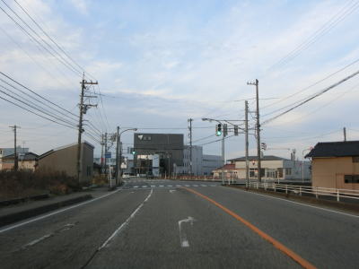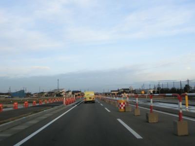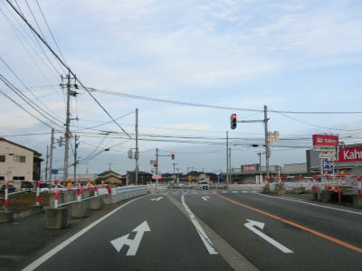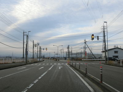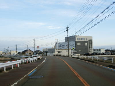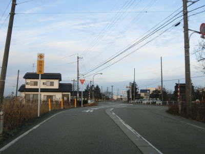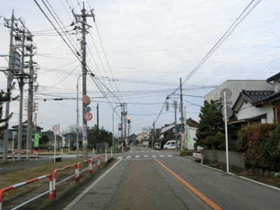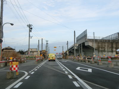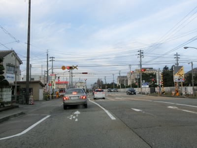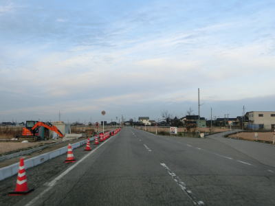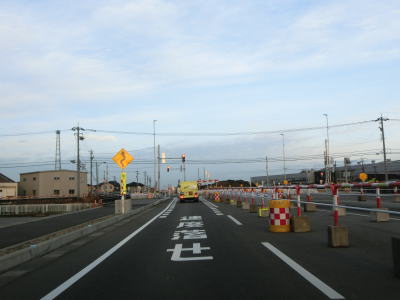 | 東富山運動広場前交差点を過ぎると対面通行となる。あいの風とやま鉄道を越える跨道橋が工事中で走行した時点では第2東岩瀬街道踏切を通らなければならなかった。片側2車線区間の車線が塞がれていたのも跨線橋が供用されていないためだろう。踏切を過ぎると市道との交差点となるが、そこがバイパスとの接続予定地点である。バイパスが供用されていないため、交差点の手前で右にカーブし、交差点の奥で左にカーブしなければならない。 | ||