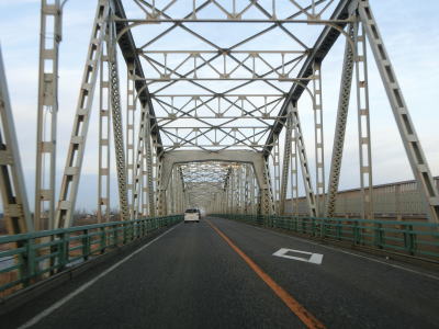 | 4車線道路を走っていると富山ライトレールの千原崎踏切と富山r1・R30千原崎交差点を相次いで通過する。踏切と交差点が近接しているため、信号機の切替りタイミングは列車の運行と連動するようになっている。 千原崎交差点を過ぎると再び中央分離帯付きの片側2車線道路になる。緩やかな勾配を上った先で上下線で分離している萩原橋を通過する。橋の下には神通川だけでなく富岩運河が流れている。 |