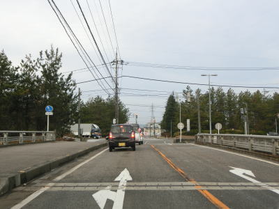 | 片口高場交差点を過ぎて少し走ると高場大橋を渡る。橋の前後に上りと下りがあるが、それを除けば平坦な状態である。カーブも存在しているが、久々湊集落の北にごく緩やかな左カーブが1ヶ所ある。 | ||